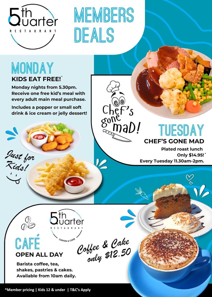 To make a booking at the Fifth Quarter Restaurant, please phone the club 4057 6478 or you can now book online!