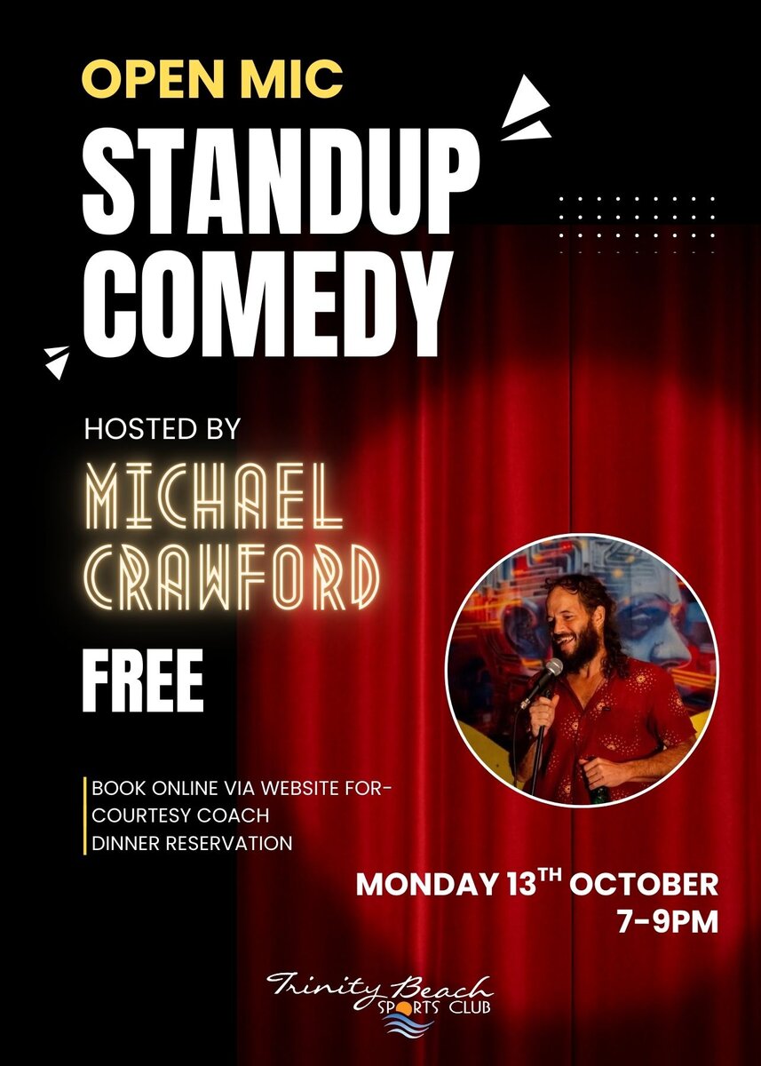 🎤 Open Mic Stand-Up Comedy Night at Trinity Beach Sports Club – Hosted by Michael Crawford Looking for a laugh? Trinity Beach Sports Club is turning up the fun with our brand-new Open Mic Stand-Up Comedy Night, hosted by the hilarious Michael Crawford! Back by popular demand, join us on Monday, 13 October, from 7:00 pm to 9:00 pm in the Sports Bar for a night of laughs, drinks, and great company. Whether you’re a first-time performer or a seasoned comedian, this is your chance to grab the mic and show off your best material — or just sit back…