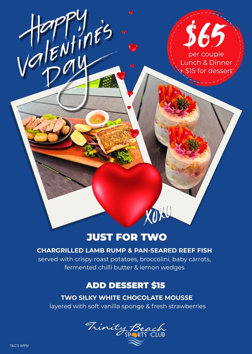 This Valentine’s Day indulge in a delicious share plate for two with Chargrilled Lamb Rump & Pan-Seared Reef Fish served with crispy roast potatoes, broccolini, baby carrots, fermented chilli butter & fresh lemon for just $65 per couple.